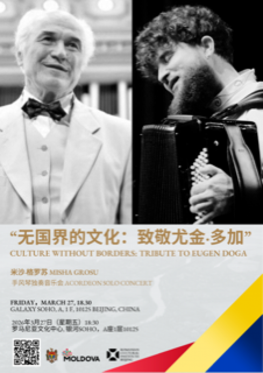 Institutul Cultural Român de la Beijing organizează, în perioada 27–29 martie 2026, seria de trei concerte „Cultură fără frontiere: Omagiu lui Eugen Doga”, susținute de Misha Grosu (concert solo de acordeon), dedicate creației unuia dintre cei mai importanți compozitori ai spațiului românesc. Evenimentele marchează 80 de ani de la nașterea lui Eugen Doga și un an de la dispariția sa, aducând în prim-plan lucrări reprezentative din repertoriul său. Manifestările sunt organizate în contextul Zilei Unirii Basarabiei cu România (27 martie 1918), evidențiind legătura culturală comună dintre România și Republica Moldova. Seria de concerte este realizată în parteneriat cu Ambasada României la Beijing, Ambasada Republicii Moldova în Republica Populară Chineză și Centrul de Cooperare Economică și Culturală Moldova–China, cu scopul de a promova patrimoniul, cultura și limba română în plan internațional.