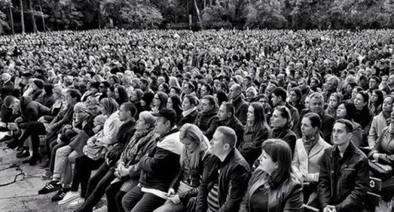 Teatrul verde a fost neincapator pentru sutele de oameni, care au venit la concertul lui Eugen Doga, astfel ca multi au stat in picioare. Multa lume a fost si pe scena amplasata in aer liber, pe care a urcat orchestra extinsa a Operei Nationale care numara peste 80 de persoane.