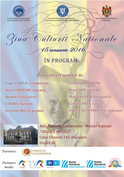 Ziua Culturii Naționale va fi marcată vineri în Aula Palatului Cantacuzino – Muzeul Național ”George Enescu”, printr-­un concert extraordinar de muzică de cameră, cu participarea interpretativă a compozitorului Eugen Doga, împreună cu baritonul Rudolf Constantin Cocriș, soprana Ana Cebotari, pianistul Ieromin Buga și cvartetul Passione: Diana Jipa, vioară I, Mădălina Panciu, vioară II,Cristina Pașa, violă, Violeta Tuța Popescu, violoncel, artiști consacrați din România și Republica Moldova. Evenimentul se va desfășura de la ora 18:30.