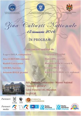 Ziua Culturii Naționale va fi celebrată, vineri, 15 ianuarie, în Aula Palatului Cantacuzino – Muzeul Național „George Enescu”, printr-un concert extraordinar de muzică de cameră, cu participarea interpretativă a compozitorului Eugen Doga, împreună cu baritonul Rudolf Constantin Cocriș, soprana Ana Cebotari, pianistul Ieromin Buga și cvartetul „Passione”: Diana Jipa, vioară I, Mădălina Panciu, vioară II, Cristina Pașa, violă, Violeta Tuța Popescu, violoncel, se arată pe site-ul oficial al muzeului.