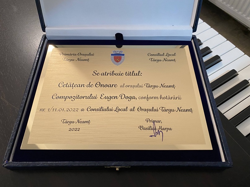 Compozitorul academician Eugen Doga a primit titlul de Cetăţean de Onoare al orașului Târgu Neamț, România. Ceremonia de acordare a onorificului titlu a avut loc la Casa Culturii „Ion Creangă”, la 16 ianuarie 2022, în prezența unui numeros public târgnemțean, care a venit la spectacolul susținut de maestrul Eugen Doga și actorul Dorel Vișan. Evenimentul a fost organizat cu ocazia Zilei Culturii Naţionale, de către Asociaţia Culturală ,,Feed Back” Iaşi – poetul Daniel Corbu și Filomena Corbu, în parteneriat cu Primăria Târgu Neamț și Casa Culturii „Ion Creangă”.