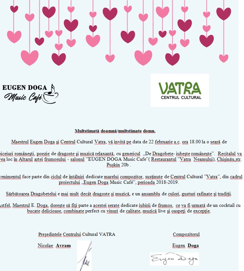 22 был прекрасный вечер в день праздника любви Dragobete в Салоне Eugen Doga. Играли и пели артисты, а также дети дошколята. Присутствовали много известных гостей, а также хозяин вечера Евгений Дога.