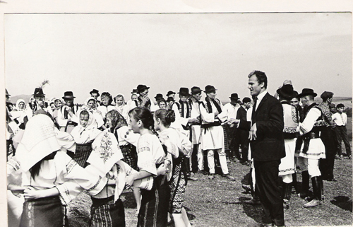 Flacara Film: compozitorul Eugen Doga incantat de frumusetea dansurilor si costumelor romanilor din Bucovina, pe platoul de filmare a lungmetrajului „Se cauta un paznic”, reg. Cernauti, 1967