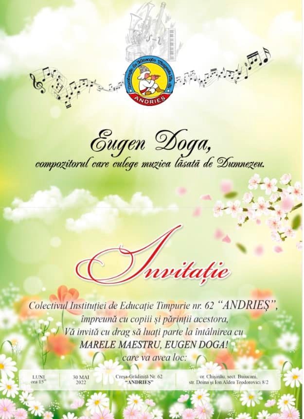 O frumoasa intalnire de suflet la data de 30 mai, ora 15.00, Gradinita nr. 62 Andries, sectorul Buiucani, copiii, cadrele didactice, parinti, oaspeti au fost ONORATI cu prezenta destinsului om de vaza al neamului nostru, marele Maestru Eugen Doga.