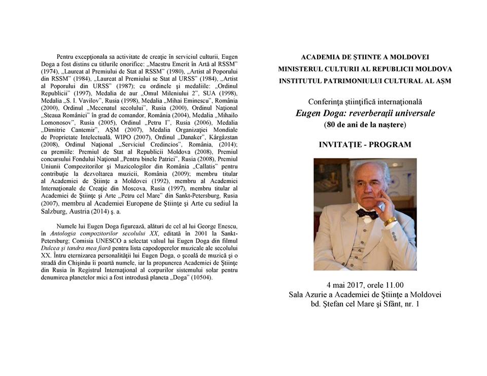 „Cea mai mare sărbătoare și cea mai de suflet este atunci când ești în jurul prietenilor, cu prietenii, cu oamenii dragi. Vă mulțumesc că sunteți”, acesta a fost gândul transmis de compozitorul-academician Eugen Doga onoratului public în debutul Conferinței ştiinţifice internaţionale „Reverberaţii  universale”, pe care Academia de Științe a Moldovei a organizat-o, la 4 mai 2017, cu prilejul aniversării a 80-a a maestrului.