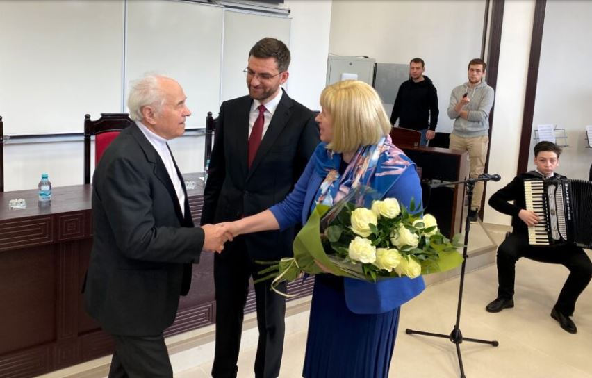 A fost întâmpinat de prorectorul USM, dr.hab. Aurelia Hanganu, dar și de directorul Institutului Cultural Român (ICR) „M. Eminescu”, la Chișinău, invitat pentru a participa la o întâlnire caldă, prietenoasă cu maestrul compozitor Eugen Doga.