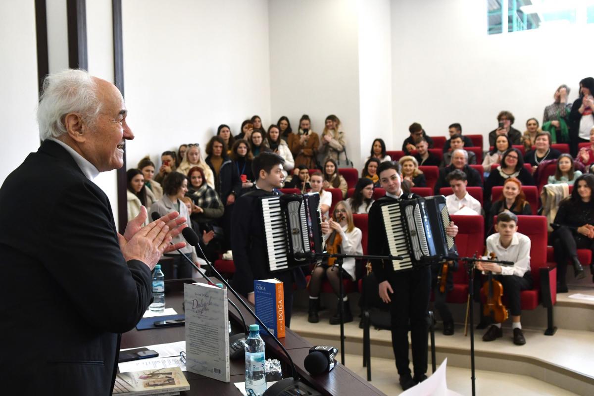Elevi de la școala de muzică ce poartă numele compozitorului Eugen Doga au încântat publicul prezent la eveniment cu opere compuse de maestru. „Avem o mulțime de talente, dar nu știm să le promovăm în lume”, a menționat compozitorul.