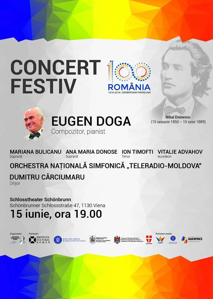 Am 15. Juni 2018 um 19:00 findet das erste Konzert des Komponisten Eugen Doga in Wien statt, in der Stadt, die als «die Hauptstadt der Musik» bekannt ist, im Schloss Schönbrunn. Eugen Doga tritt vor die Rampe mit dem Nationalen Symphonischen Orchester «Teleradio-Moldova» (Kischinau, Moldau), Dirigent - Dumitru Cârciumaru. Am Konzert nehmen die folgenden Solosänger teil: Mariana Bulicanu (Sopran, die Solistin des Nationaltheaters der Orts und des Balletts von Moldau), Ana Maria Donose (Sopran, die Nationaloper von Rumänien, Jassy), Dumitru Mazu (Tenor) und Vitalie Advahov.