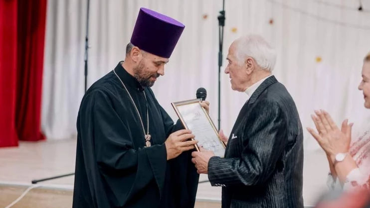 În alocațiunea sa, Protoiereul mitrofor Nicolae a transmis cuvintele de binecuvântare ale Înaltpreasfintitului Mitropolitului Vladimir, Întâistătător al Bisericii Ortodoxe din Moldova, oferindu-i Maestrului Eugen Doga o Diplomă de merit din partea Mitropoliei.