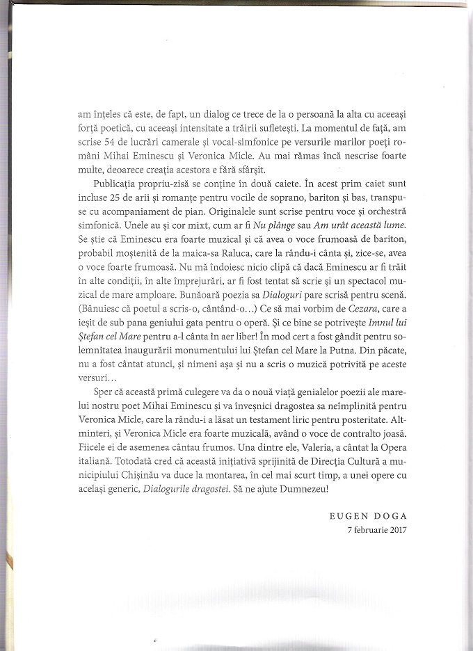 Pentru prima data la Chișinău va fi lansată cartea de arii și romanțe „Dialogurile dragostei”, volumul I, muzică semnată de compozitorul Eugen Doga și inspirată din iubirea cutremurătoare a marelui nostru poet Mihai Eminescu şi Veronica Micle. Evenimentul va avea loc miercuri, 19 aprilie, ora 18.00, la Filarmonica Națională "Serghei Lunchevici”.