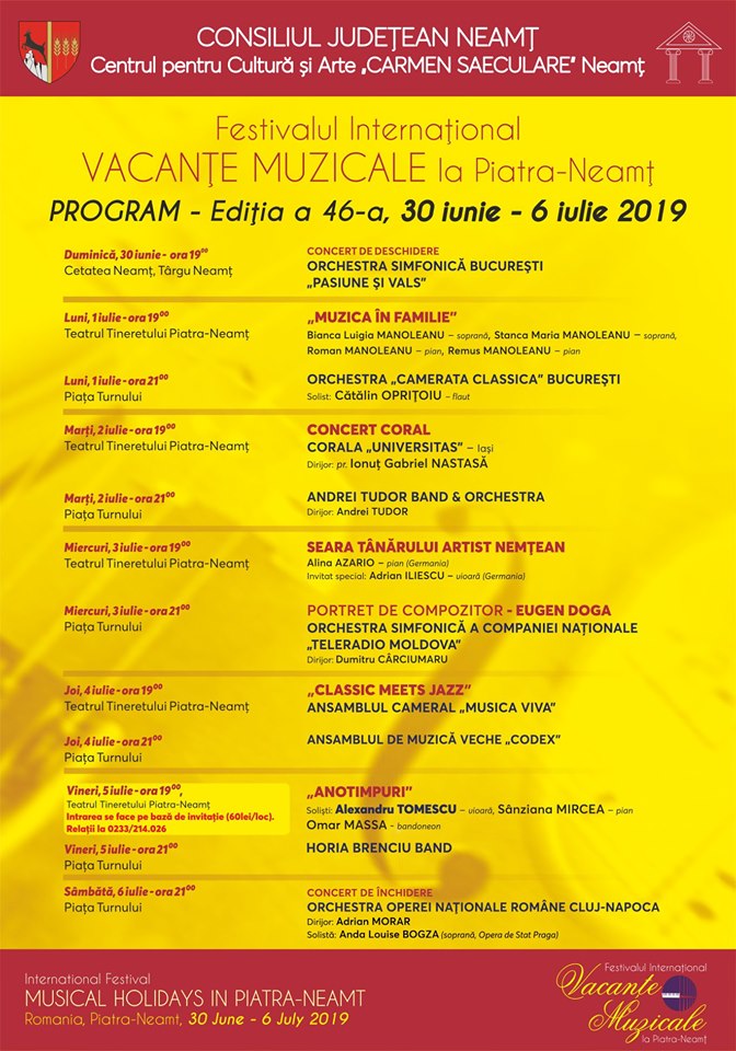 În perioada 30 iunie – 6 iulie, Centrul pentru Cultură şi Arte „Carmen Saeculare” Neamţ organizează cea de a XLVI-a ediţie a „Vacanţelor Muzicale la Piatra-Neamţ”.