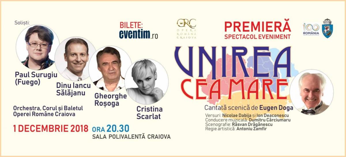 Paul Surugiu (Fuego), Dinu Iancu Sălăjanu, Gheorghe Roșoga și Cristina Scarlat sunt invitații spectacolului extraordinar „Unirea cea Mare”, pe muzica reputatului compozitor Eugen Doga, eveniment al Operei Române Craiova cu prilejul Centenarului Marii Uniri. Spectacolul, care reunește peste 100 de artiști, Orchestra, Corul și Baletul Operei Române Craiova, va avea loc pe 1 decembrie 2018, la Sala Polivalentă din Craiova, fiind realizat cu sprijinul municipalității. Biletele pot fi cumpărate online pe platforma eventim.ro sau la Agenția de bilete a instituției, din strada „Mihai Viteazul” nr. 7 (tel. 0351.442.471).