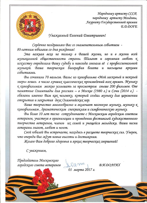 Дорогой Евгений Дмитриевич! Поздравляем Вас с прекрасным юбилеем! Счастливы быть Вашими современниками, коллегами и друзьями! Горды тем, что Вы входите в состав Правления нашей Гильдии композиторов кино Союза кинематографистов Российской Федерации!